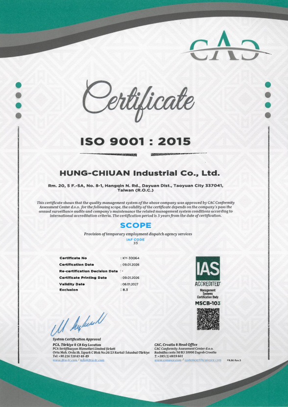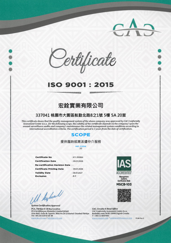 宏銓實業正式榮獲 ISO 9001:2015 品質管理系統認證